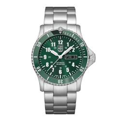 Die Luminox Sport Timer Uhr kombiniert ein Schweizer Automatikwerk mit einem sportlichen Look. Der markante, grüne Lünettenring dieser raffinierten Uhr ist keramikbeschichtet und ist daher besonders kratzfest. Ein passendes, grünes Sunray-Zifferblatt verfügt über eine Tages-Datumsanzeige und wird durch weiße Ziffern, Indizes und Zeiger ergänzt. Um das Schweizer Automatikwerk SELLITA zur Geltung zu bringen, verfügt dieser Zeitmesser über einen durchsichtigen Gehäuseboden mit einem geschwärzten Rotor, der mit dem Luminox-Logo versehen ist.