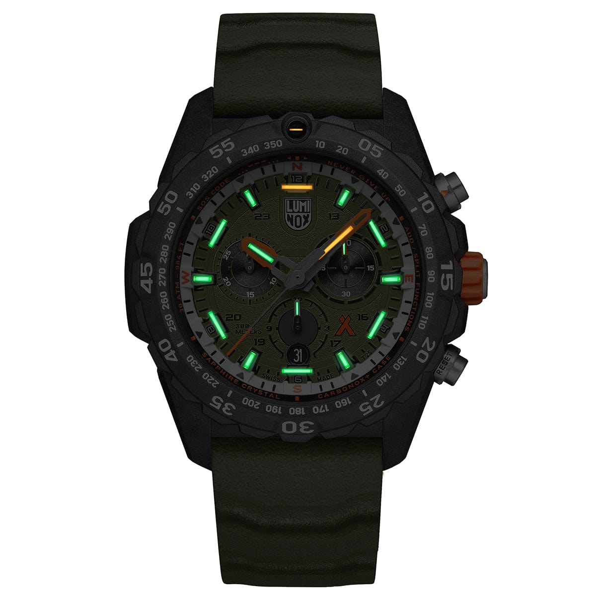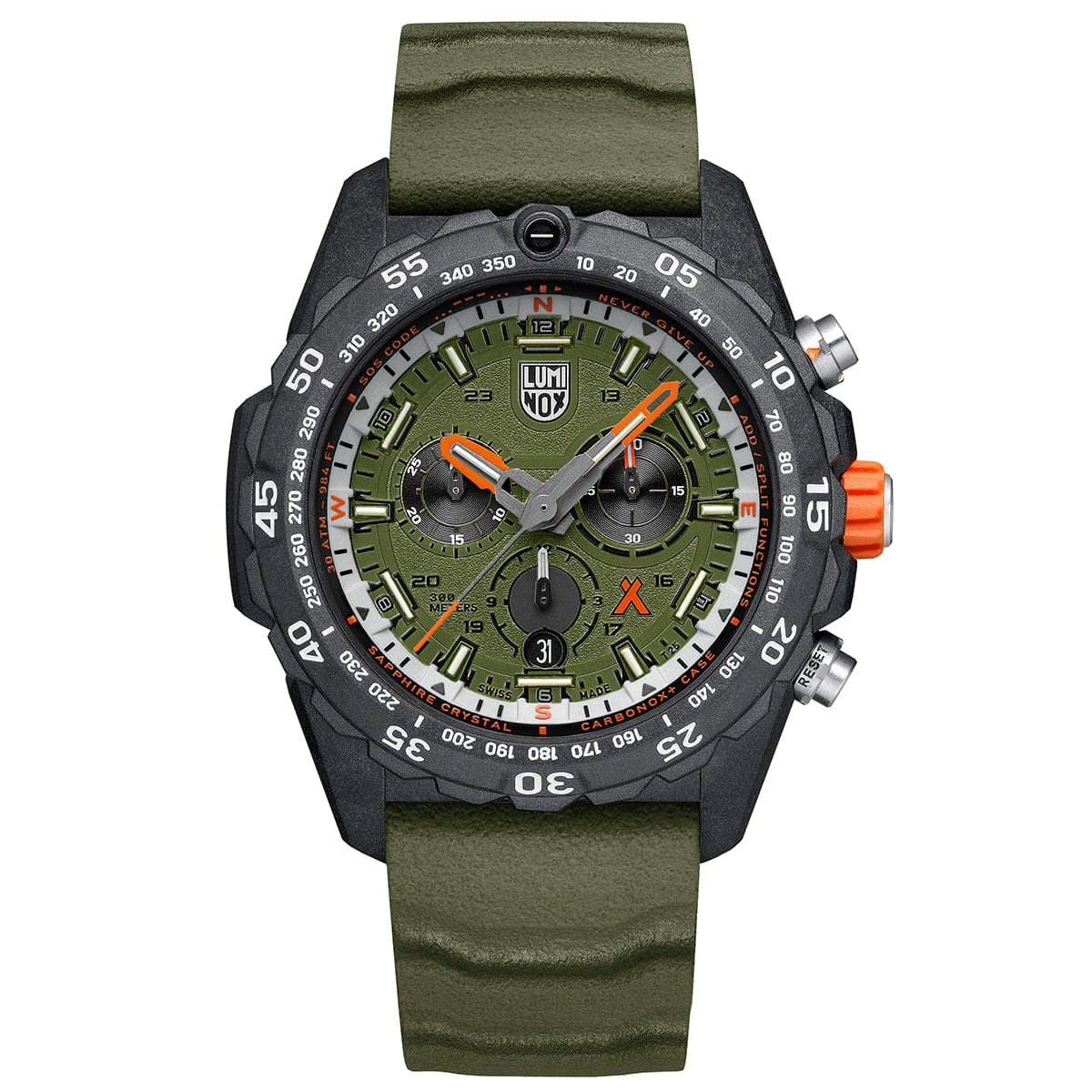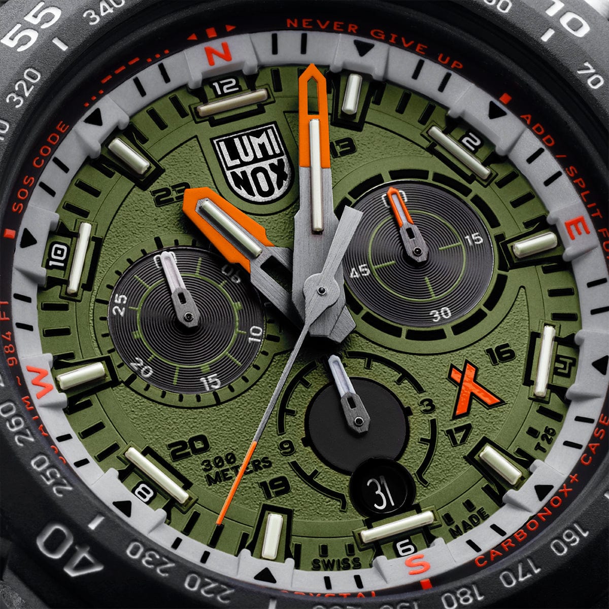 Die Bear Grylls Survival Master 3740 Chronograph Limited Edition wurde gemacht, um dir zu helfen, in den härtesten Gegenden zu überleben. Das 45 mm super-robuste CARBONOX+ Gehäuse und die einseitig drehbare Lünette machen diesen Zeitmesser extrem leicht. Die beeindruckenden Luminox Light Technology Röhrchen ermöglichen es dem Träger, die Zeit unter allen Lichtbedingungen bis zu 25 Jahre lang problemlos abzulesen. Die Uhr trägt das Bear-Grylls-Logo auf dem Zifferblatt und die charakteristische orangefarbene verschraubte Krone. Bear's Motto "Never Give Up" ist in Orange auf dem Gehäuseboden neben seiner Unterschrift eingraviert. Es erinnert den Träger an diese wichtige Einstellung, die Bear Grylls geholfen hat, viele kritische Situationen zu überstehen, und inspiriert ihn dazu.